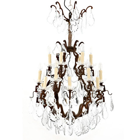 Люстра 16-ти рожковая Chandelier Chateau de Chatillon на кованной металлической арматуре цвета античная латунь с патиной. Декор: прозрачные хрустальные подвески на арматуре. Высота светильника регулируется за счет звеньев цепи. Лампочки в комплект не входят.