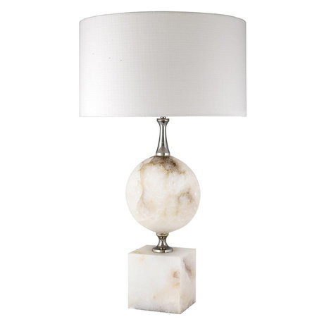 Настольная лампа Table Lamp Creek на основании кремового цвета из камня алебастра. Текстильный абажур белого цвета скрывает лампу.